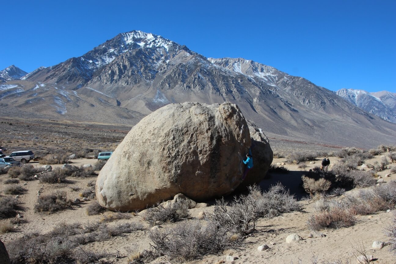 Por lo general, los bulderistas eligen medirse con la escalada local en la zona superclásica de Buttermilk Country, donde los famosos highballs de escaladores como Nina Williams, Timmy Kang y Kevin Jorgenson se elevan en un paisaje de postal. Al conducir por Buttermilk Road, un camino de tierra que lleva a la zona de boulder, uno ya siente la inmensidad de los bloques y el infinito potencial de esta zona.