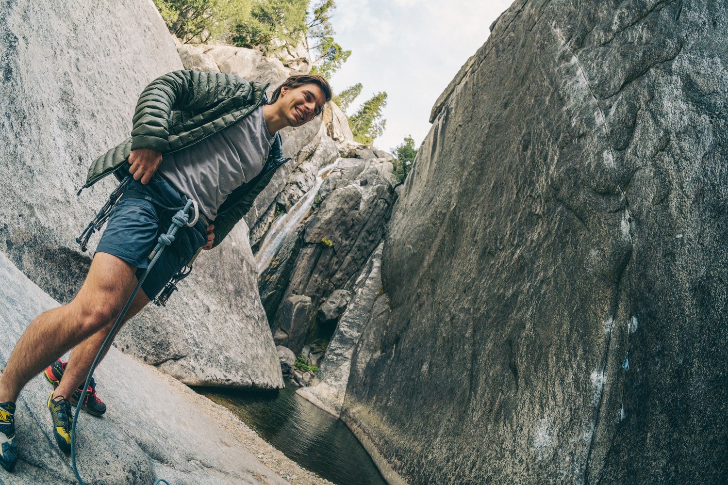 Los pies de gato para escalada trad deben ser cómodos y no demasiado agresivos, ya que a menudo tendrás que llevarlos puestos durante mucho tiempo. Al igual que con la cuerda y el asegurador, el tipo de escalada que realices (si es de un solo largo o de varios) puede influir en tu elección. Algunos modelos de zapatillas están diseñados específicamente para escalar fisuras: suelen tener una suela bastante plana y simétrica, y una parte superior con inserciones de tela para proteger los tobillos de la abrasión, o una construcción en el empeine más alta que las zapatillas normales. Los modelos «todoterreno» son un buen punto de partida para quienes se inician en la escalada tradicional; la experiencia y tus preferencias personales guiarán luego tu elección hacia un modelo específico.