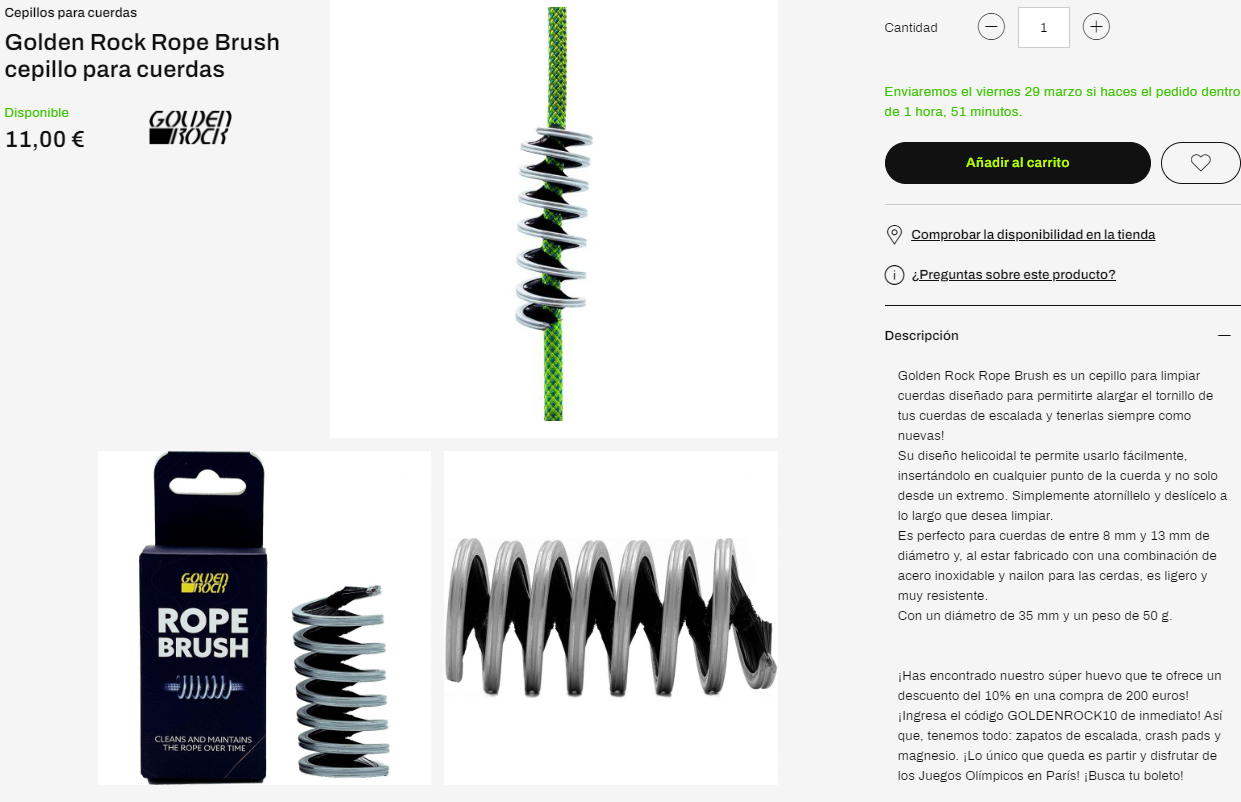El siguiente indicio nos sugería buscar entre los productos específicos para limpiar la cuerda: El Golden Rock Rope Brush es el cepillo que te permite prolongar la vida útil de la cuerda y obtener un sustancioso código de descuento!