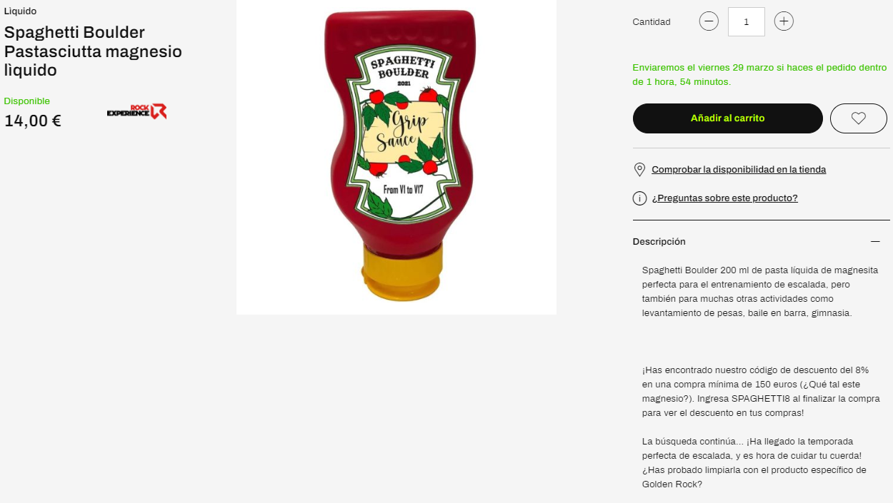 Es la inconfundible magnesita líquida de Spaghetti Boulder Pastasciutta: ¡puedes estar seguro de que no la confundirás con las demás cuando escalas en el gimnasio!