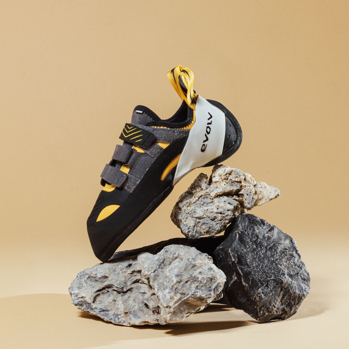 Pasemos a las Shaman de Evolv, de las que notamos inmediatamente la forma extremadamente arqueada y una construcción con media suela: son zapatillas de alto nivel, de las cuales existe una contraparte "pro" recomendada especialmente para su uso en competiciones. Las Shaman están hechas de materiales sintéticos, por lo que conservan su forma durante mucho tiempo y tienen una rigidez sostenida. Su particularidad se encuentra en las tecnologías aplicadas para su construcción: desde la entresuela que ayuda a mantener estable el zapato hasta el VTR, que utiliza suelas de diferentes espesores en los diferentes puntos del zapato, los Shaman encierran lo mejor de Evolv. Son particularmente apreciados por aquellos con un estilo de escalada más variado y por todos los escaladores que buscan un modelo de alto nivel para alternar días en el acantilado con días de boulder.