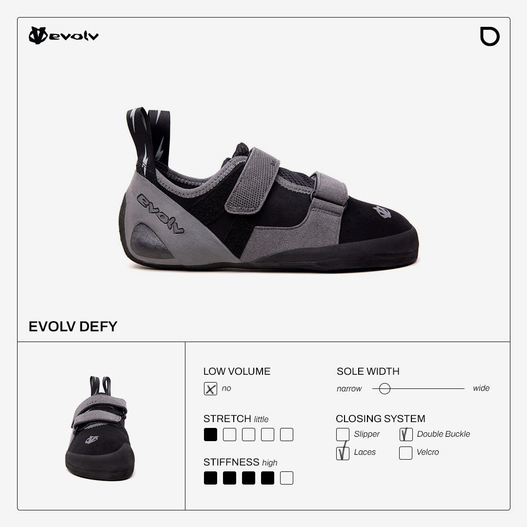 Si las Tarantula son una opción muy apreciada por quienes aman los pies de gato de cuero y valoran la comodidad y transpirabilidad de los materiales naturales, las Defy de Evolv son una de las opciones favoritas para veganos y aquellos que prefieren materiales sintéticos. Las Defy son, por excelencia, los pies de gato todoterreno que logran mantener su forma y estructura con el tiempo, garantizando una buena precisión en paredes verticales. Gracias a los insertos de goma de grosor variable en la parte interior, también son especialmente cómodos, ideales para usos prolongados o en el gimnasio. En este modelo, el sistema de cierre se maneja con un doble velcro cruzado, facilitando y acelerando el proceso de poner y quitar, típico de la escalada en gimnasio o bouldering al aire libre. Las Defy son pies de gato para principiantes prácticamente indestructibles.