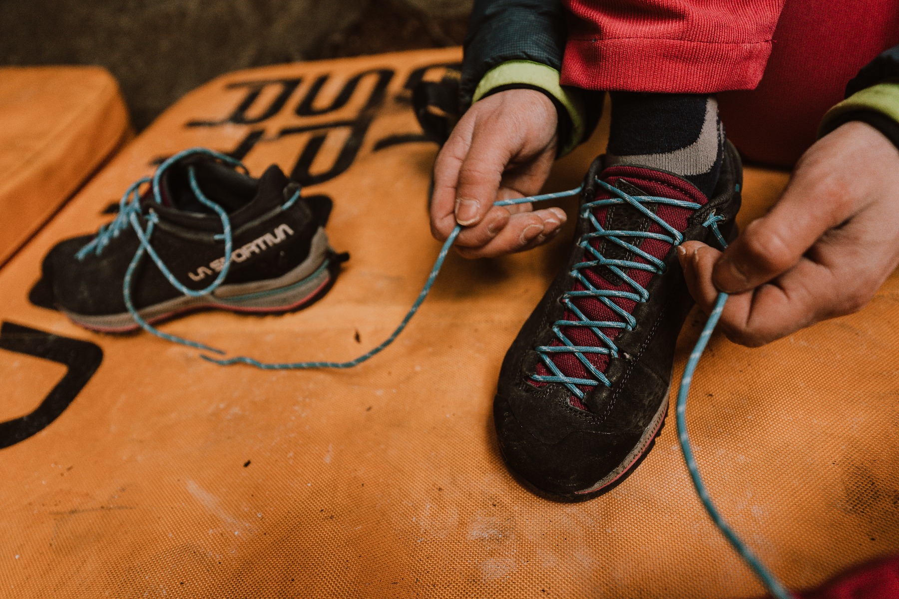 El cordón de los zapatos de aproximación retoma el preciso y envolvente de los zapatos de escalada. Credits to La Sportiva.