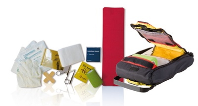 Dentro puedes encontrar guantes, apósitos, tijeras y todo lo que puedas necesitar para curar una herida. También encontrarás una férula de aluminio para fracturas.