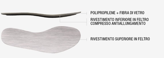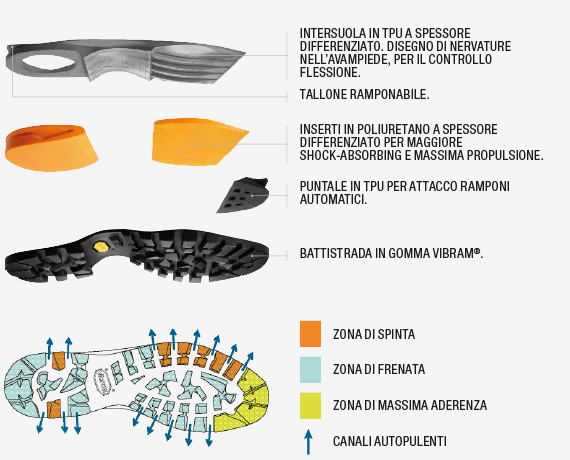 La parte inferior, en cambio, está compuesta por una plantilla en Pro-Fiber 20 de Polipropileno + Fibra de vidrio con la parte superior recubierta de fieltro para mantener siempre el pie bien caliente, y por una suela en Vibram Total Traction.